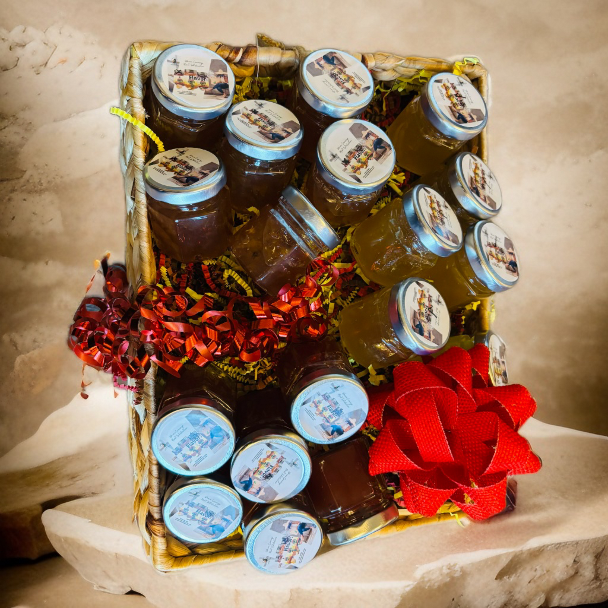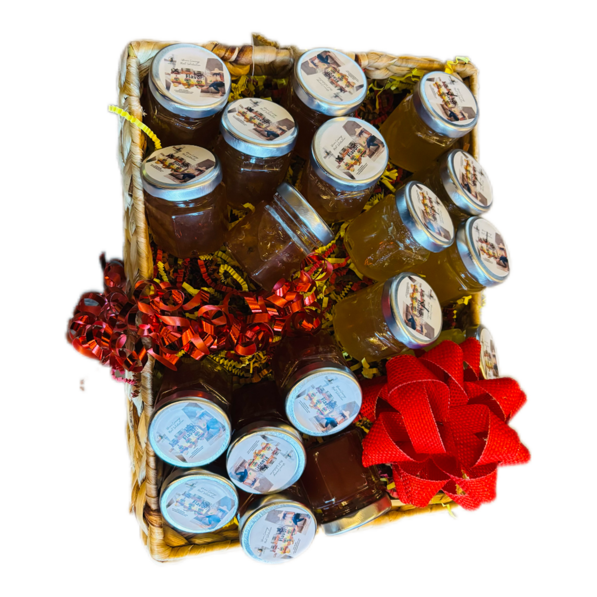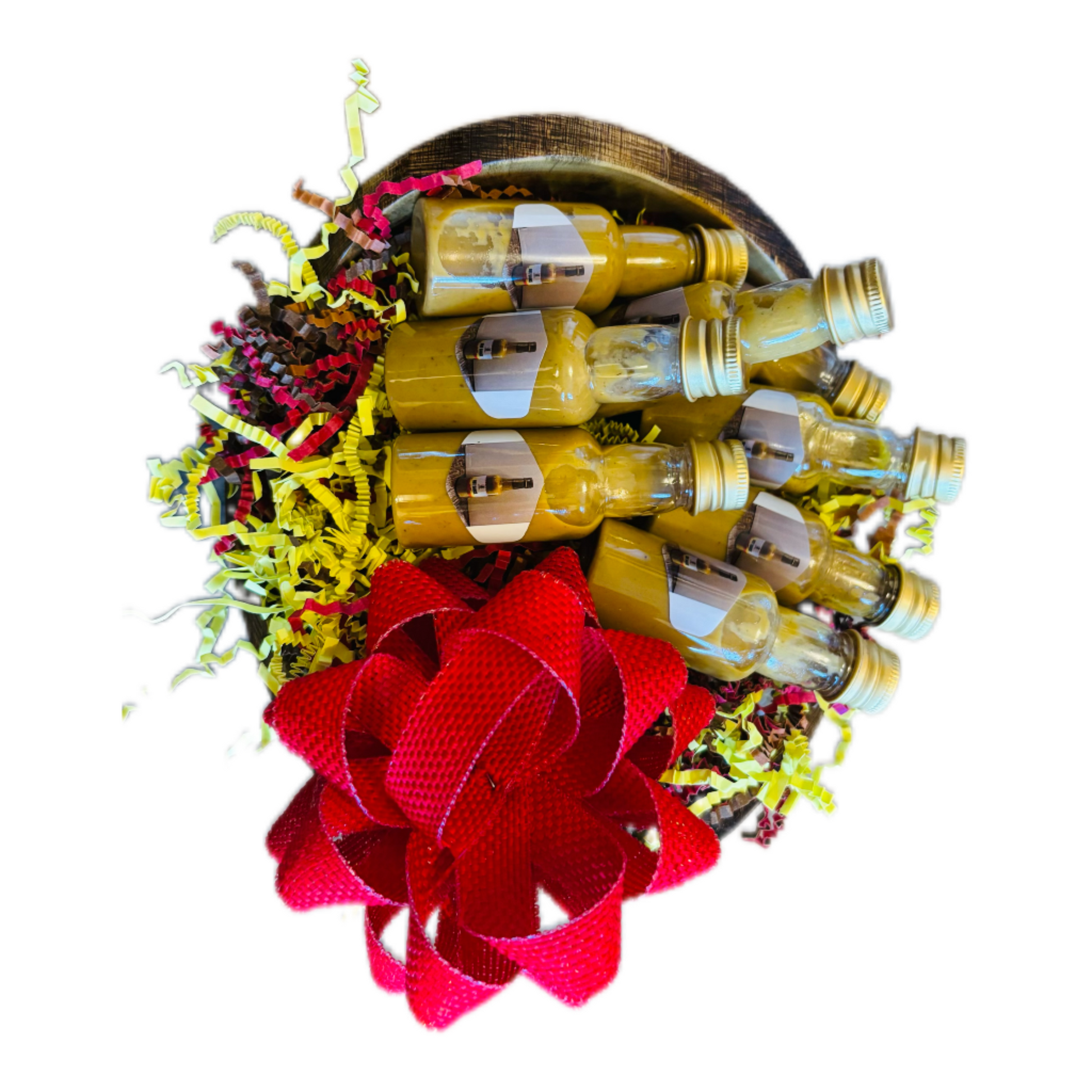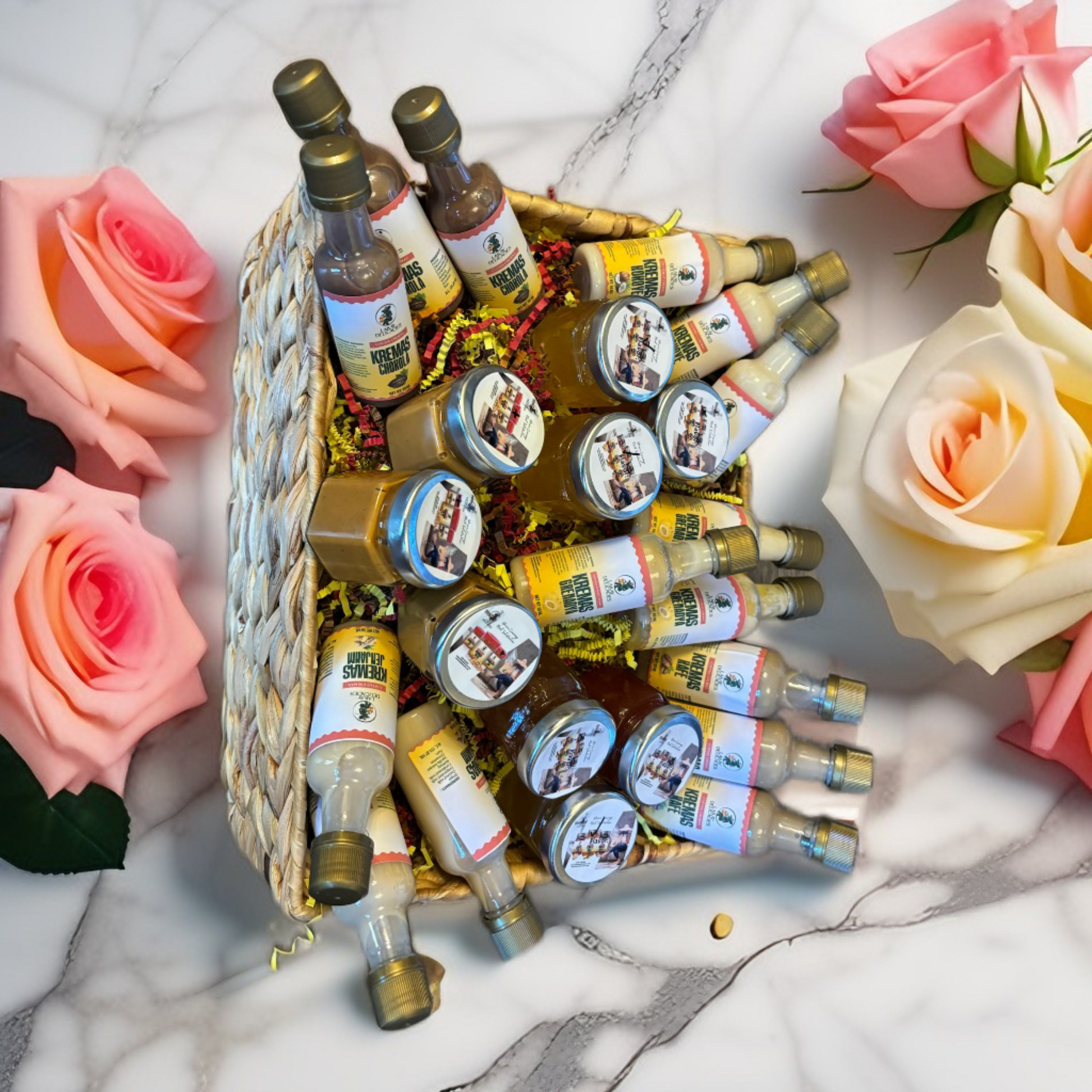 The image shows a basket filled with small bottles of Kremas and peanut butter. They are presented as a small souvenir or party favor, which is a common practice for events such as weddings, communions, and other celebrations. Price is shown per bottle/jar. Basket of 50 bottles/Jars.