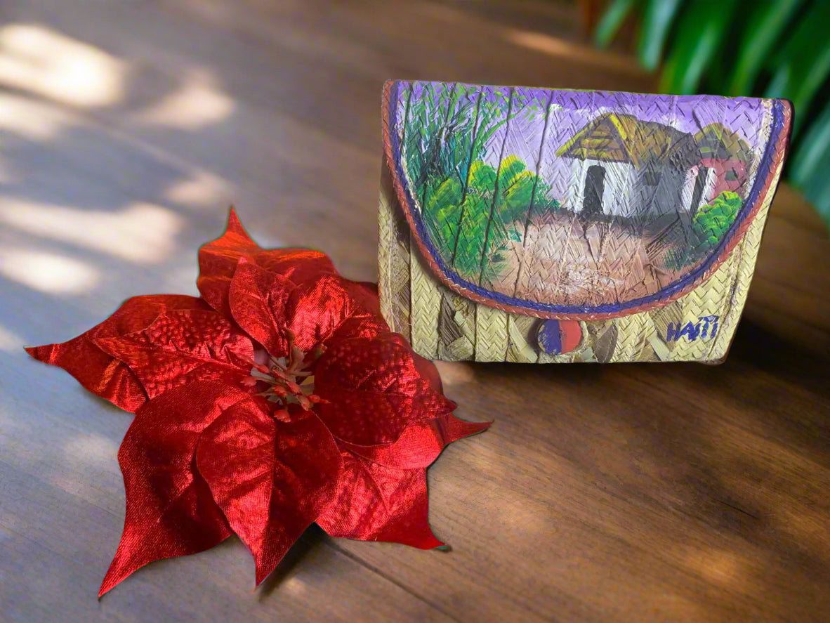 This Handcrafted Woven Straw Clutch for Women is made from woven straw, featuring a flap closure. The flap is adorned with a colorful, hand-painted scene depicting palm trees and 3 small houses figures in a vibrant setting. Below the painted scene, the word "Haïti" is written in a stylized script, indicating its origin or inspiration. A small, colorful button or embellishment is also visible on the clutch painted in blue and red.
