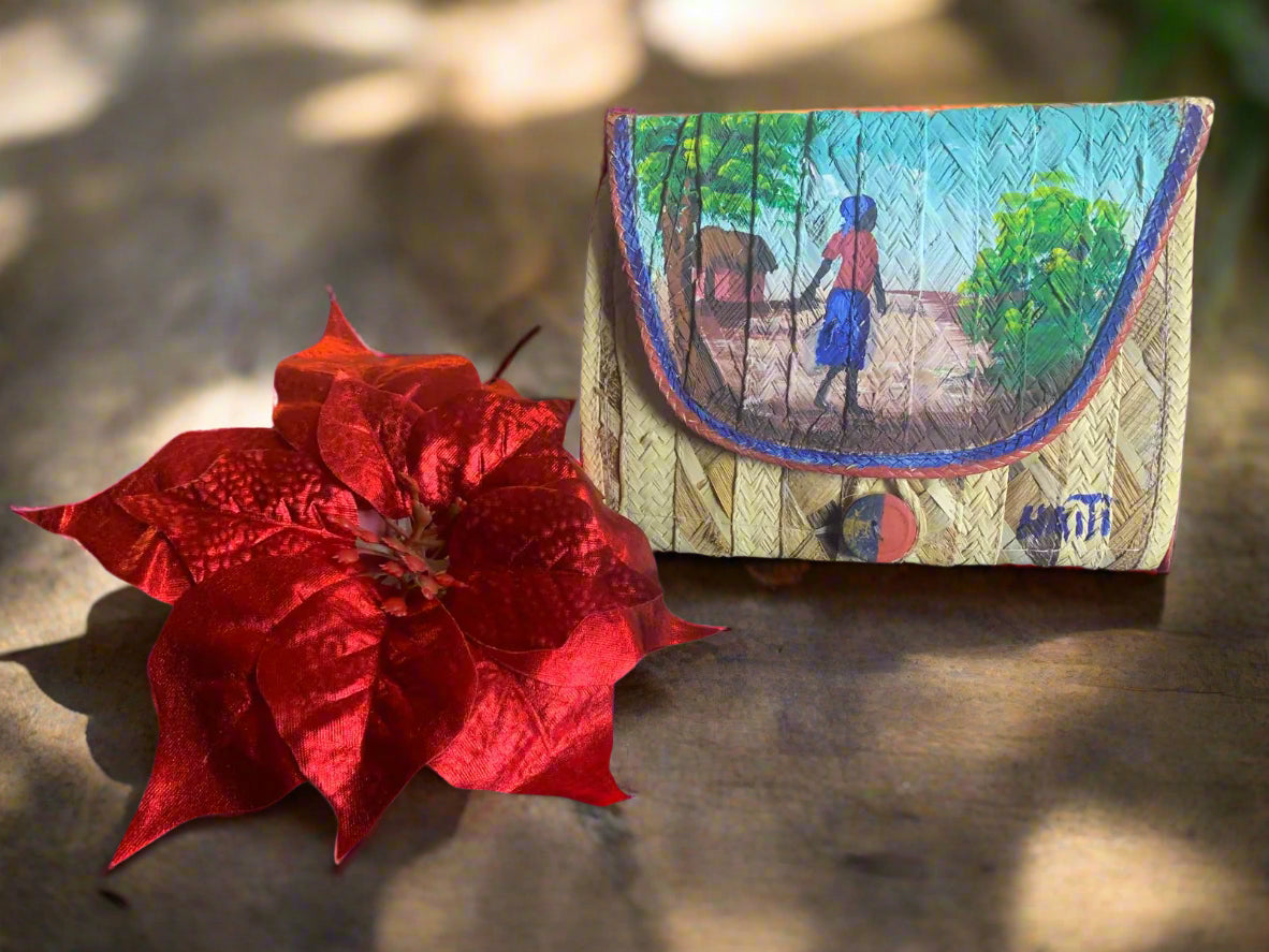 This Handcrafted large Woven Straw Clutch for Women is made from woven straw, featuring a flap closure. The flap is adorned with a colorful, hand-painted scene depicting palm trees and 3 small houses figures in a vibrant setting. Below the painted scene, the word "Haïti" is written in a stylized script, indicating its origin or inspiration. A small, colorful button or embellishment is also visible on the clutch painted in blue and red.