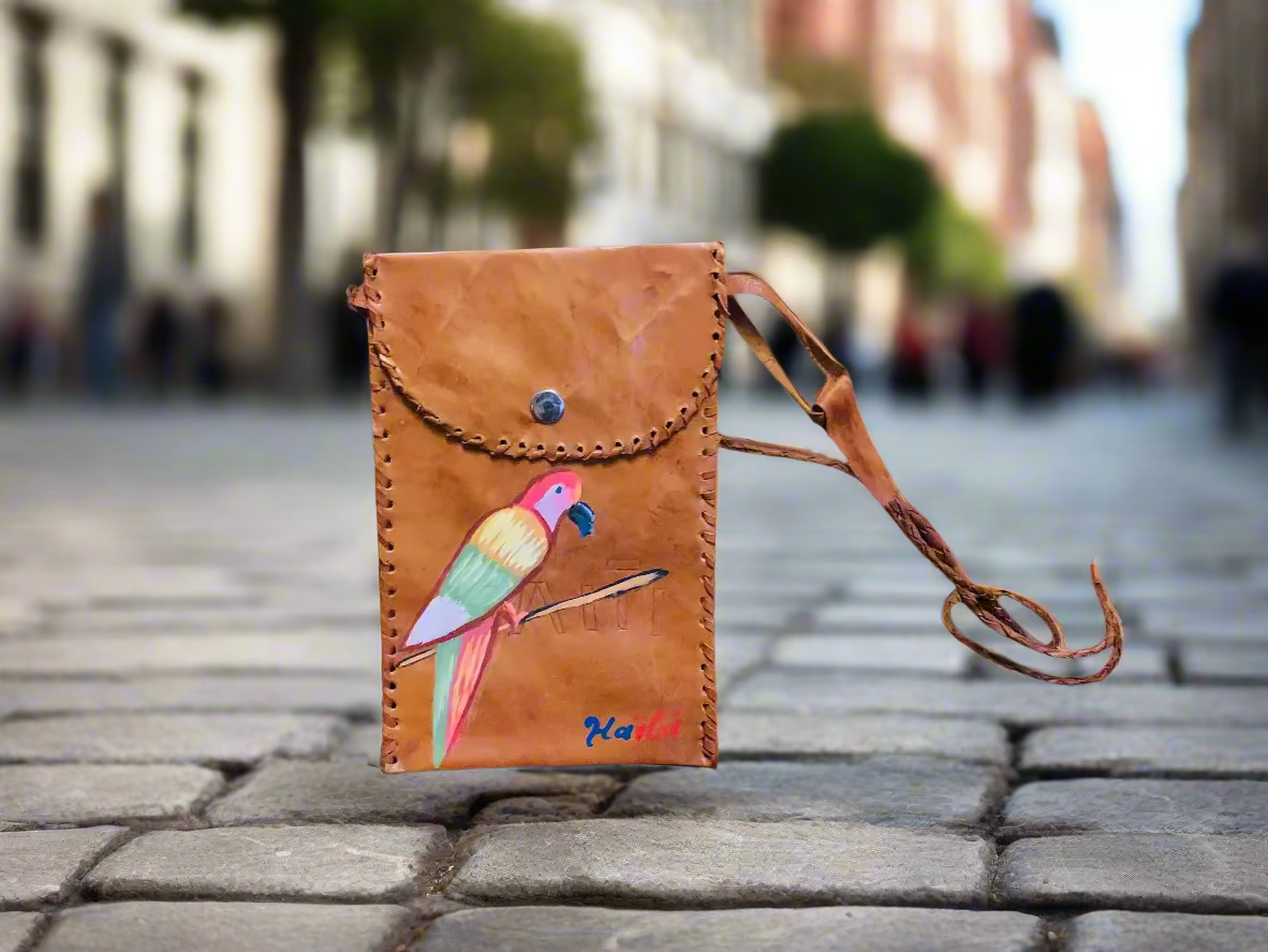 This Handcrafted Travel Crossbody leather bag, light brown with decorative lacing along its edges with a shoulder strap. The front of the pouch features a vibrant, multi-colored Parrot design. The word "Haïti" is written in a cursive style in the lower right corner of the pouch in red and blue. The shoulder strap is made of braided leather.