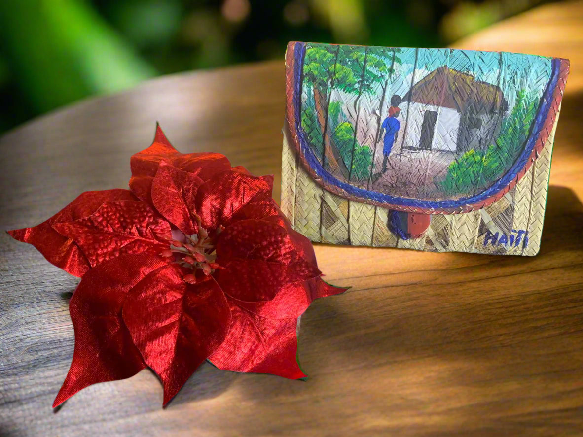 This Handcrafted Woven Straw Clutch for Women is made from woven straw, featuring a flap closure. The flap is adorned with a colorful, hand-painted scene depicting palm trees and 3 small houses figures in a vibrant setting. Below the painted scene, the word "Haïti" is written in a stylized script, indicating its origin or inspiration. A small, colorful button or embellishment is also visible on the clutch painted in blue and red.