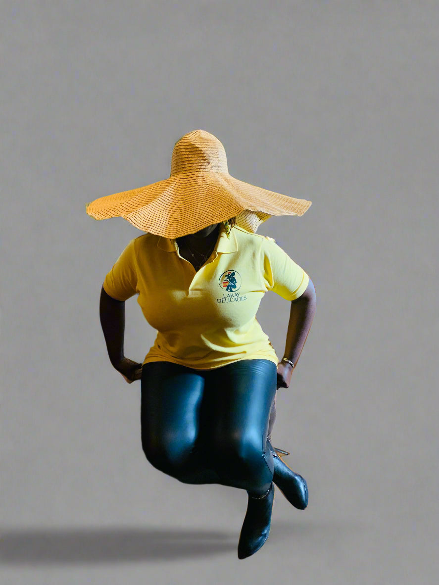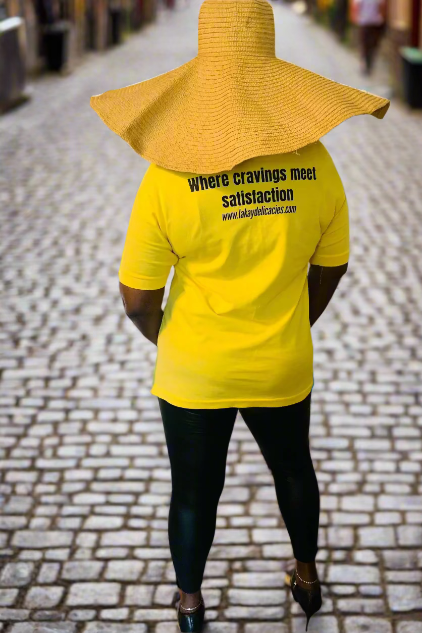 - A medium bright yellow, and red short-sleeved polo shirt with a small logo or emblem on the left chest area "Lakay delicacies"