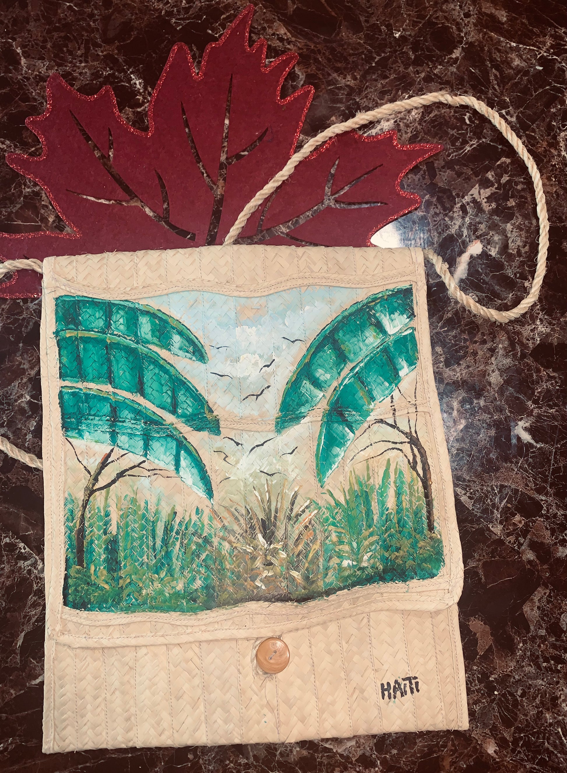 This one-of-a-kind Woven straw Crossbody chest bags, of Haitian origin, is more than an accessory, its a piece of art. Carefully handcrafter and hand painted by a skilled Haitian artisan, depicting tropical elements such as large green leaves, trees, grass, a sky, and birds, reflecting a common style found in Haitian folk art and crafts. The bag features a simple wooden button closure and a twisted rope strap. A prominent "Haïti" inscription written in black on the front.
