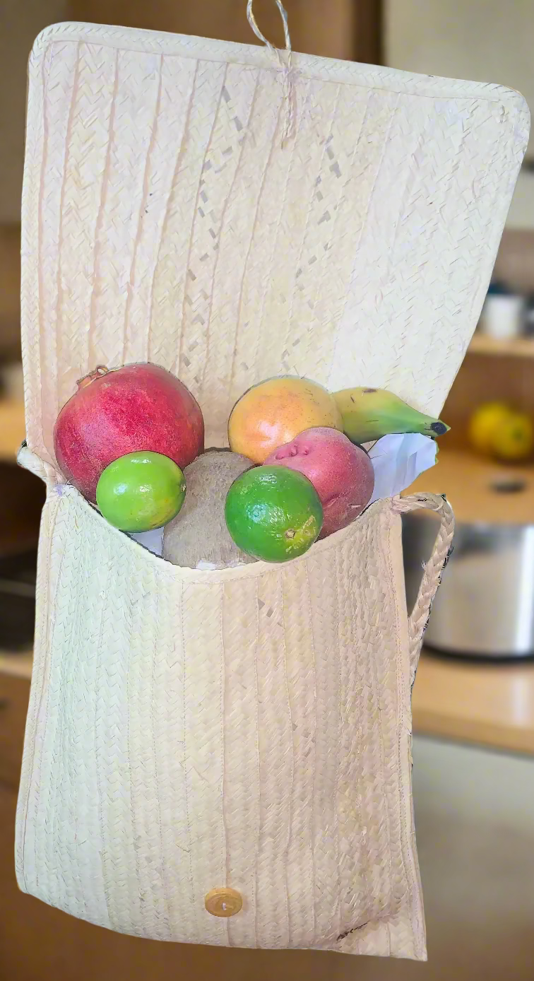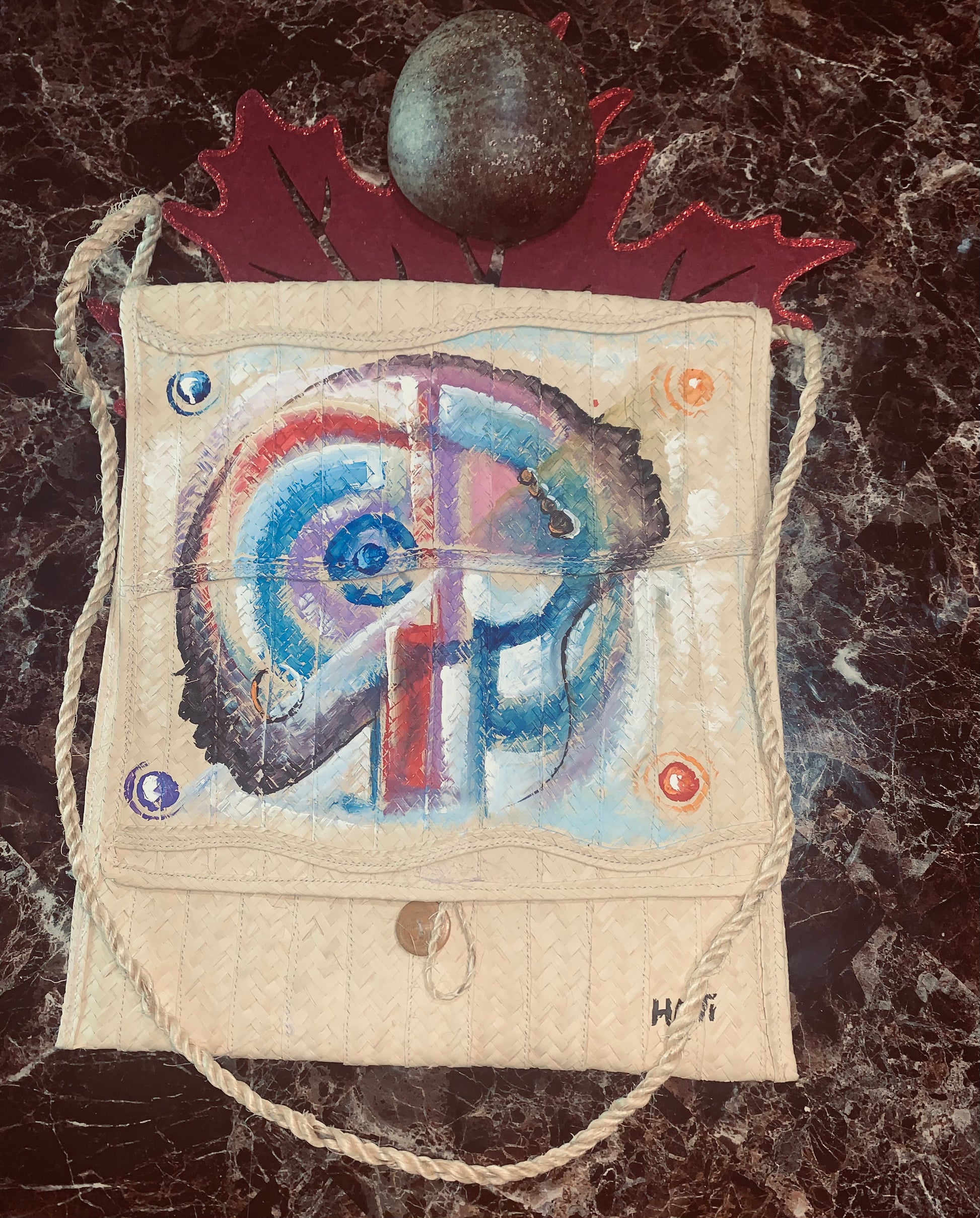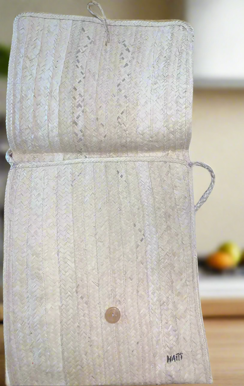 This one-of-a-kind Woven straw Crossbody chest bags, of Haitian origin, is more than an accessory, its a piece of art. Carefully handcrafter and hand painted by a skilled Haitian artisan, displays an abstract design on its front flap. The artwork features a colorful, spiral or eye-like motif in shades of blue, purple, red, and orange, against the natural beige color of the straw. The Crossbody chest bags features a flap closure secured by a wooden button and a loop. A prominent "Haïti" inscription written in black.