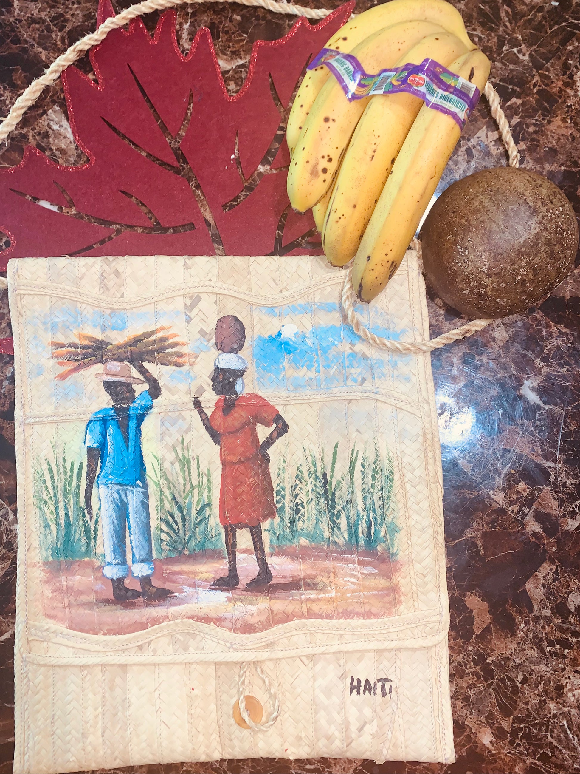 In the background, there is a decorative, red, leaf-shaped object and a bunch of bananas and a coconut, adding to the tropical and cultural ambiance of the overall composition. This piece could be considered a statement accessory, blending traditional craftsmanship with contemporary artistic expression; often incorporating natural materials and vibrant depictions of cultural elements.